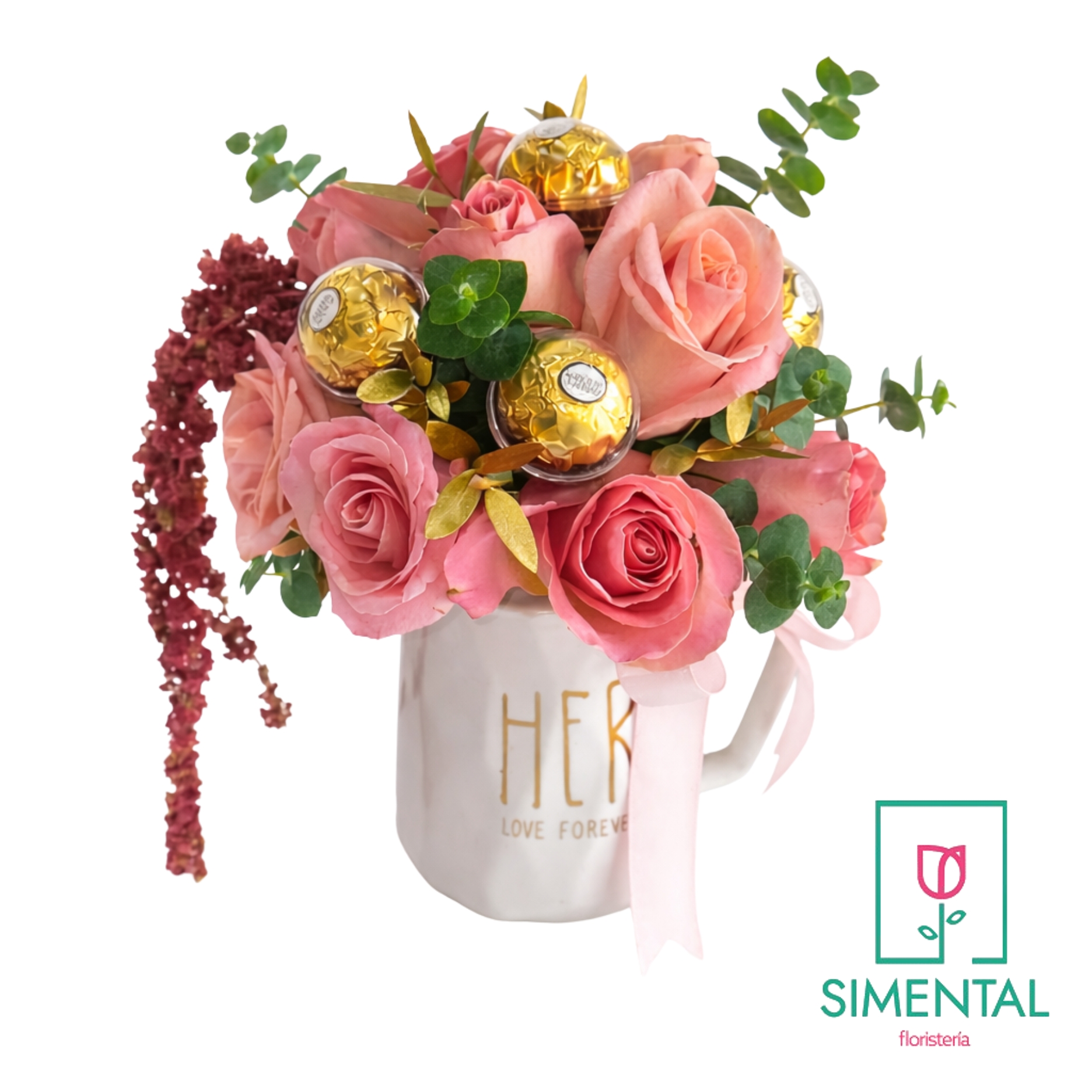 Un detalle que conquista a primera vista. Este arreglo combina la suavidad de las rosas en tonos rosados con la dulzura irresistible de finos chocolates, creando una experiencia que enamora todos los sentidos.
