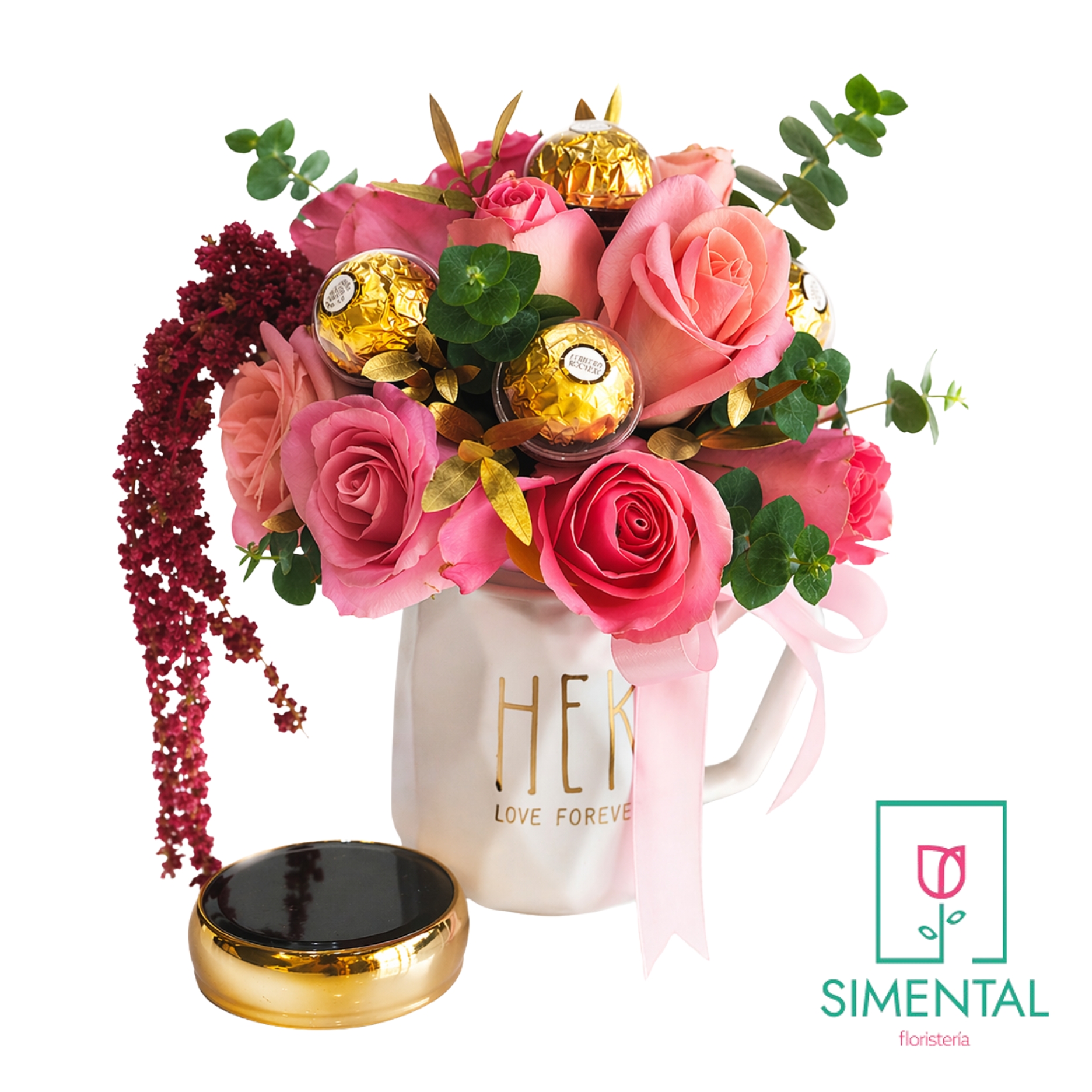 Presentado en una delicada taza con acabado sutil y acompañado de un listón en tono pastel, cada elemento está cuidadosamente seleccionado para transmitir cariño, ternura y sofisticación. Los acentos verdes y las texturas florales aportan frescura, mientras que los chocolates dorados elevan el diseño con un toque de lujo.