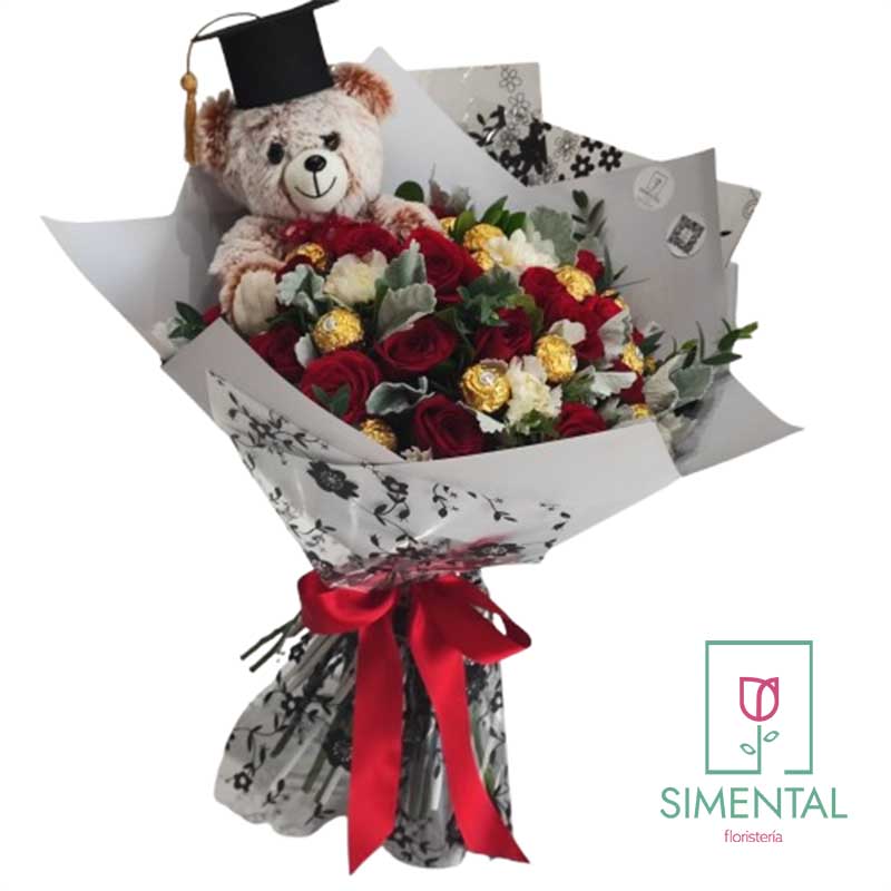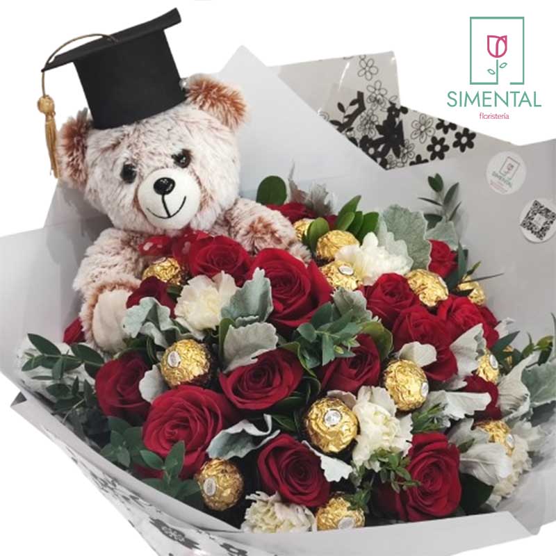Para los graduados que terminan una etapa mas de sus estudios, el mejor de los detalles. Un bouquet de rosas, chocolates y peluche.