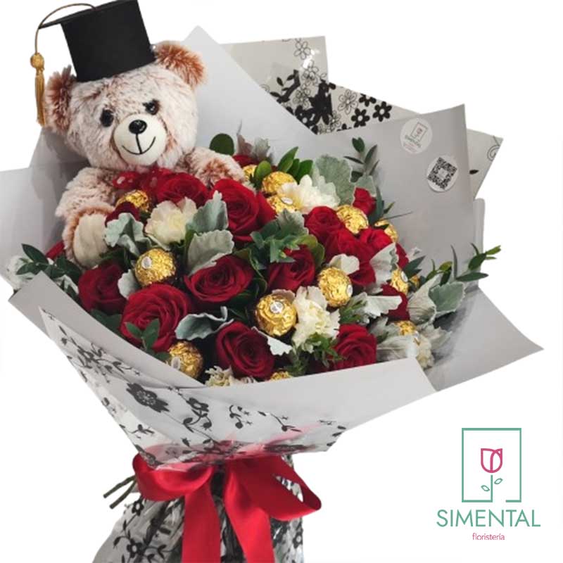 Bouquet Graduación Rosas, Chocolates y Peluche