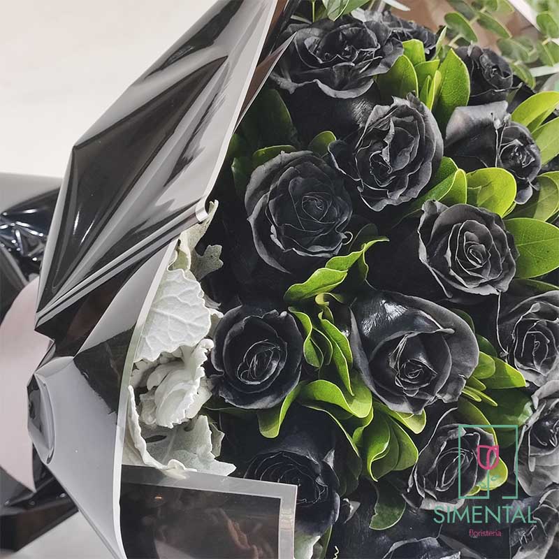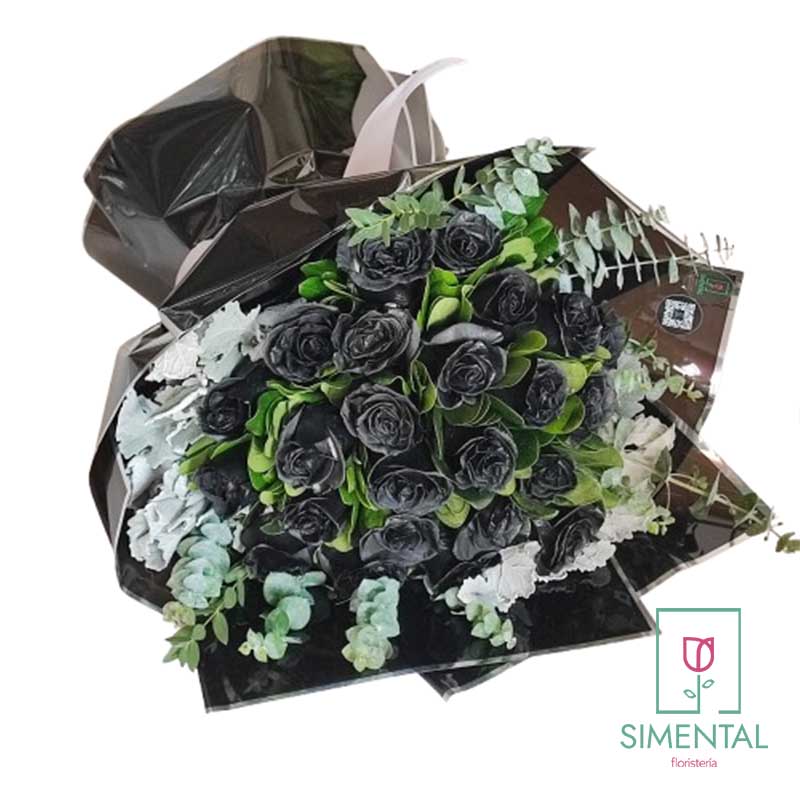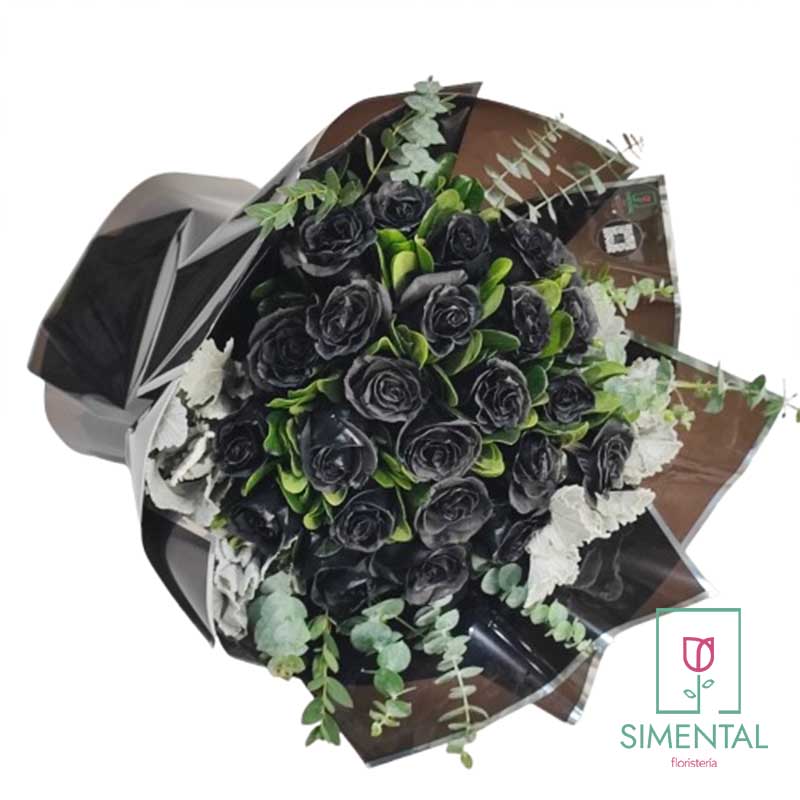 Bouquet de 24 rosas negras, un singular y novedoso diseño, se complementa con follajes finos de temporada. Un regalo para cualquier ocasión.