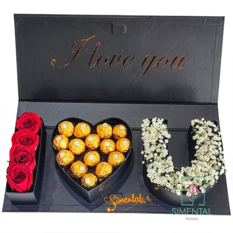 En su interior encontrarás una combinación irresistible, rosas rojas frescas que representan amor, pasión y romance, corazón de chocolates tipo Ferrero para endulzar el momento y conquistar también por el paladar, inicial decorativa con flores blancas (ghypso) que aporta un toque delicado, moderno y profundamente romántico.