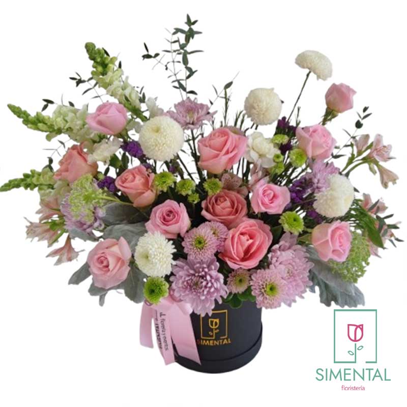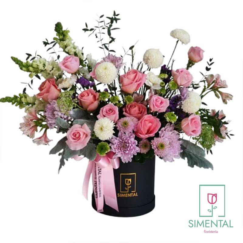 «Dulce Amanecer» combina delicadas rosas, crisantemos , perritos, margaritas y follajes finos , en una elegante base negra tipo sombrerera, decorada con un lazo de color de rosa.