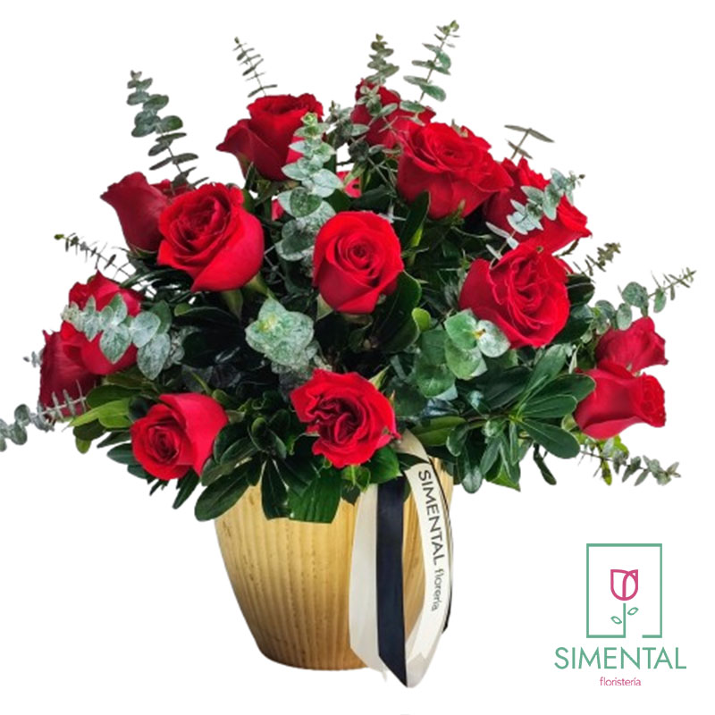 Presentado en una base dorada, este arreglo no solo resalta la intensidad del rojo, sino que convierte las flores en un verdadero regalo de impacto, ideal para expresar sentimientos grandes e inolvidables.