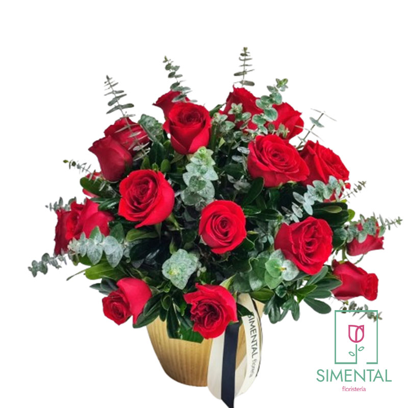 Este arreglo reúne hermosas rosas rojas seleccionadas, símbolo del amor profundo y la admiración, acompañadas de finos toques de eucalipto natural, que aportan frescura, textura y un acabado sofisticado.